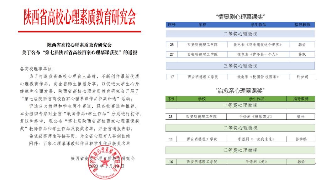 近日,学校心理健康教育工作获得陕西省高校心理素质教育研究会多项表彰。雷竞技raybet登录入口荣获陕西省高校心理素质教育研究会“心理育人标兵单位”,1人荣获“最奉献心理育人好主任”,1人荣获“百嘉心理辅导师”,1...