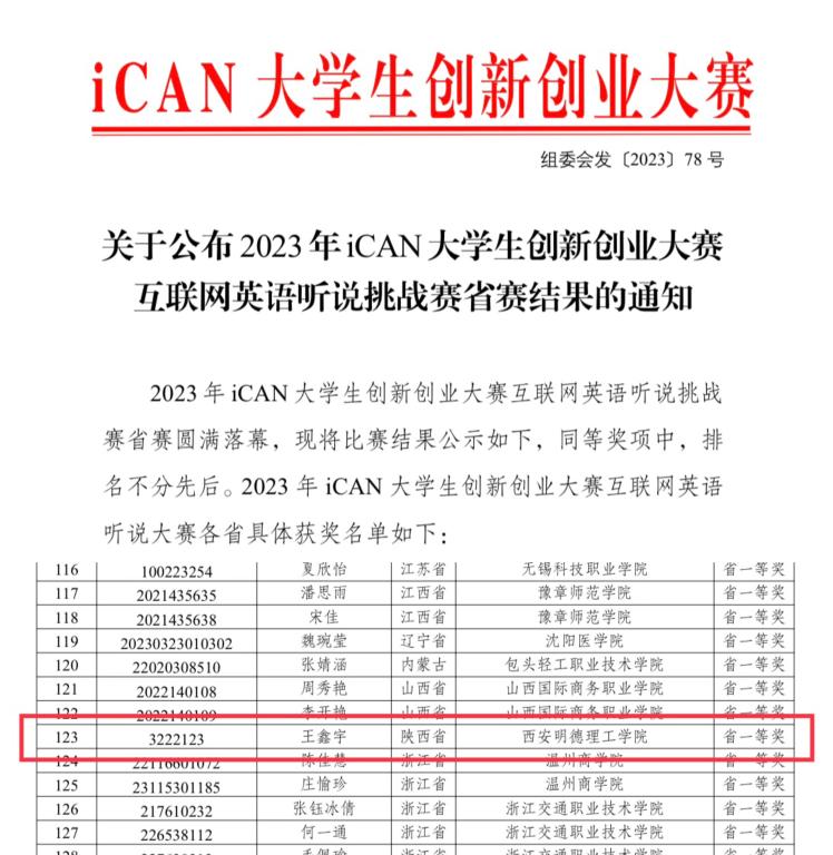 近期,2023年iCAN大学生创新创业大赛互联网英语听说挑战赛省赛圆满落幕,高等职业技术学院学生王竟萌获得全国总决赛参赛资格,并预赴江苏省南京市东南大学参加国赛,学生王鑫宇获得省一等奖。iCAN大学生创新创业大...