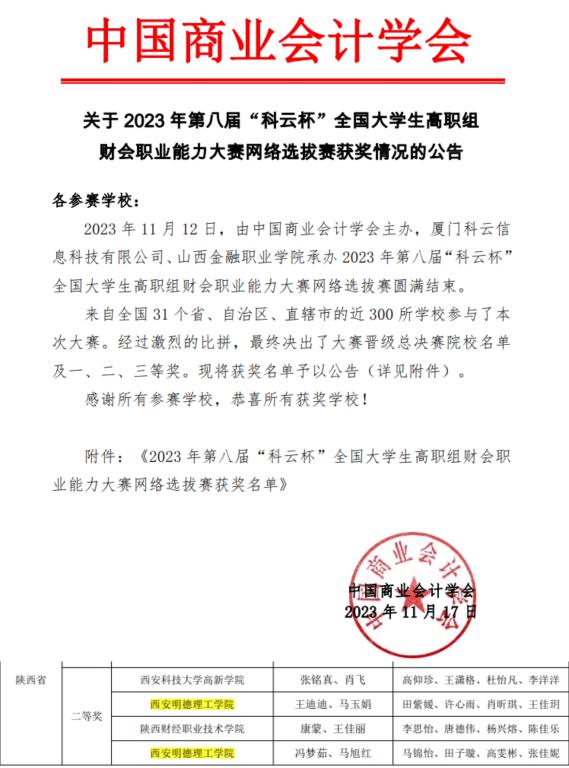 近日,2023年第八届“科云杯”全国大学生高职组财会职业能力大赛网络选拔赛圆满结束,雷竞技官网高等职业技术学院学生荣获陕西省二等奖两项,获奖学生名单如下:该赛项顺应了数字时代发展,匹配企业在业财税融合下的智能...