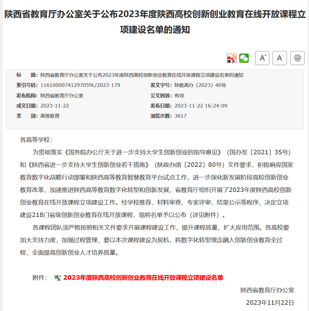 根据陕西省教育厅办公室《关于开展2023 年度陕西高校创新创业教育在线开放课程立项建设工作的通知》精神,学校积极组织各二级学院择优推荐申报,顺利完成了申报工作。11月22日,陕西省教育厅办公室发布《关于公布20...