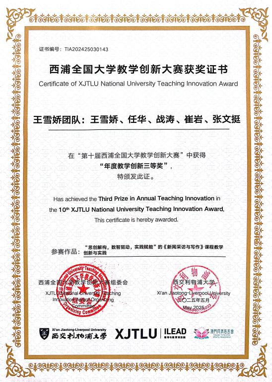 喜报 | 艺术与设计学院王雪娇团队在第十届西浦全国大学教学创...