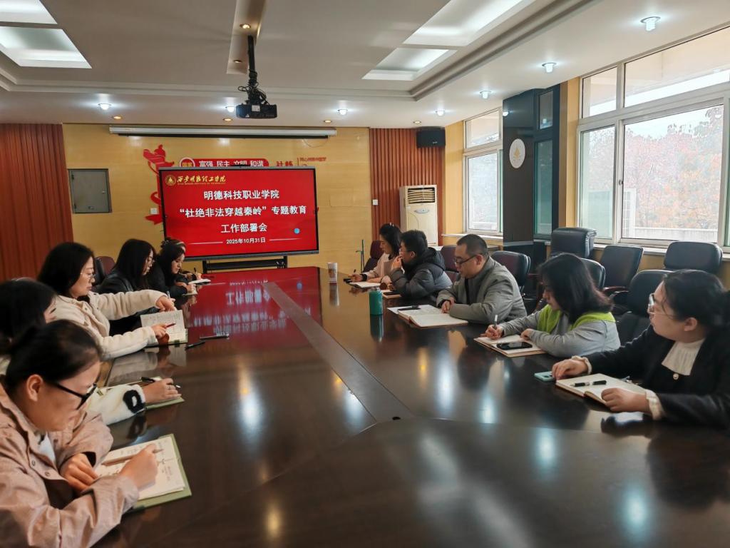 为切实增强师生安全意识,筑牢生命安全防线,维护秦岭生态环境,10月31日上午,明德科技职业学院在长安校区明理楼216会议室、莲湖校区德雅楼A102会议室线上线下联合召开“杜绝非法穿越秦岭”专题教育工作部署会。会...