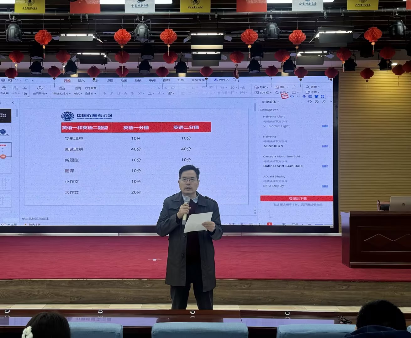 报告会伊始,终南书院副院长王波义老师上台致辞,对何凯文老师的到来表示热烈欢迎,并对同学们寄予了殷切期望。随后,何凯文老师以其深厚的学术底蕴和丰富的实战经验,为同学们带来了一场精彩的考研英语备考讲座。