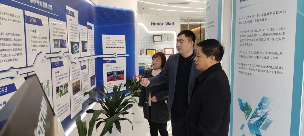 在广州中望龙腾软件股份有限公司认证部总监郑会会的热情接待下,舒忠院长一行首先开启了对公司的全面参观,从公司的展示厅到研发中心,再到员工办公区域,大家深入了解了广州中望龙腾在工业软件领域深厚的技术积淀、丰富的产品线以及广泛的行业应用情况,其先进的技术和创新的理念给考察组一行留下了深刻印象。