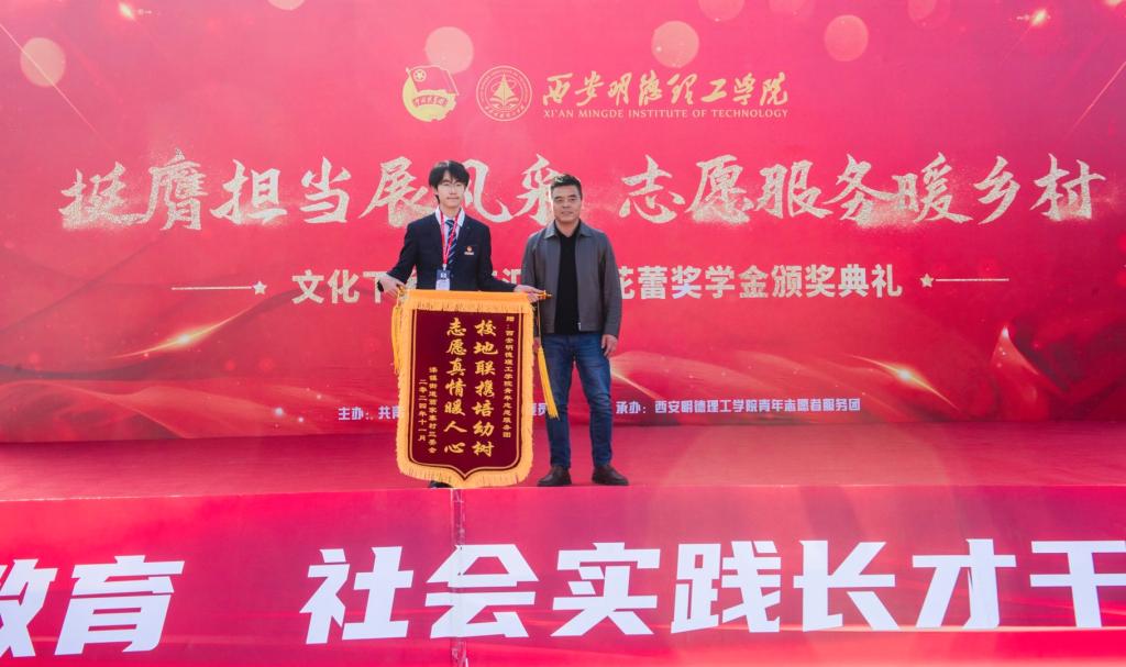 村党支部书记兼村委会主任徐立亲自将一面象征着荣誉与信任的锦旗授予学校青年志愿者服务团,表达了全体村民对学校志愿者无私奉献和辛勤付出的深切感激与高度认可。