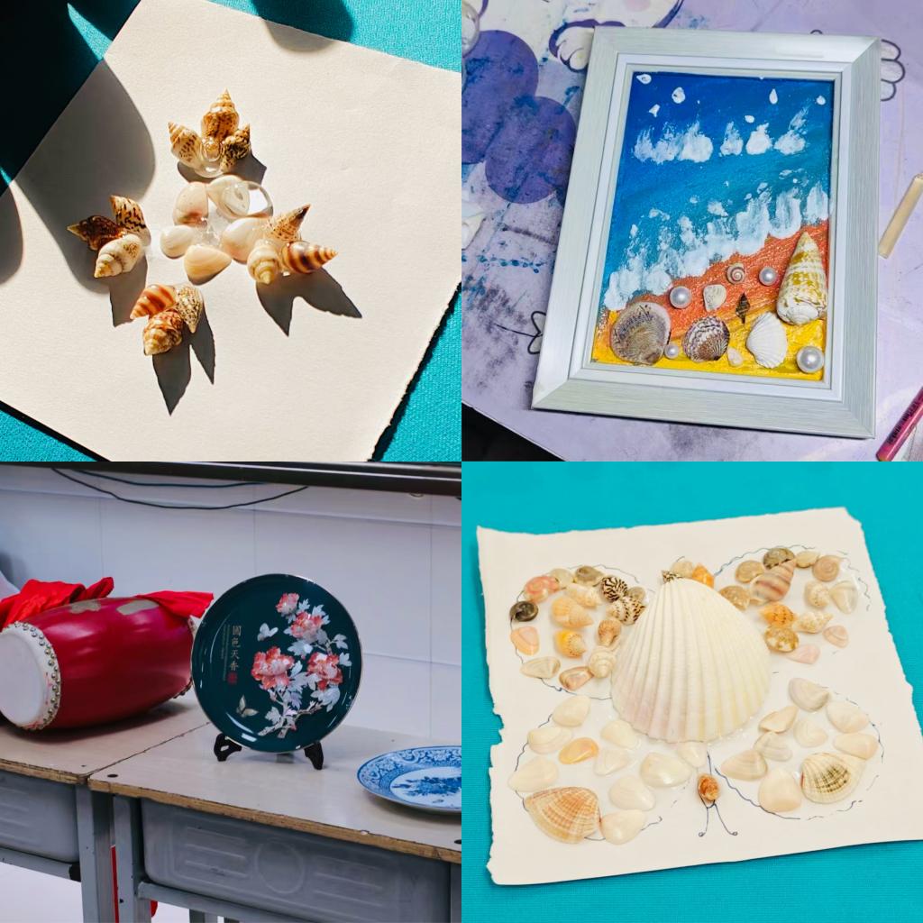 实践队结合非遗传承的文化故事以击鼓传花的形式为小学生们介绍贝雕的发展历史与现状,小学生们分组体验了泥塑或贝壳创作,每个人的脸上都洋溢着满足与自豪。