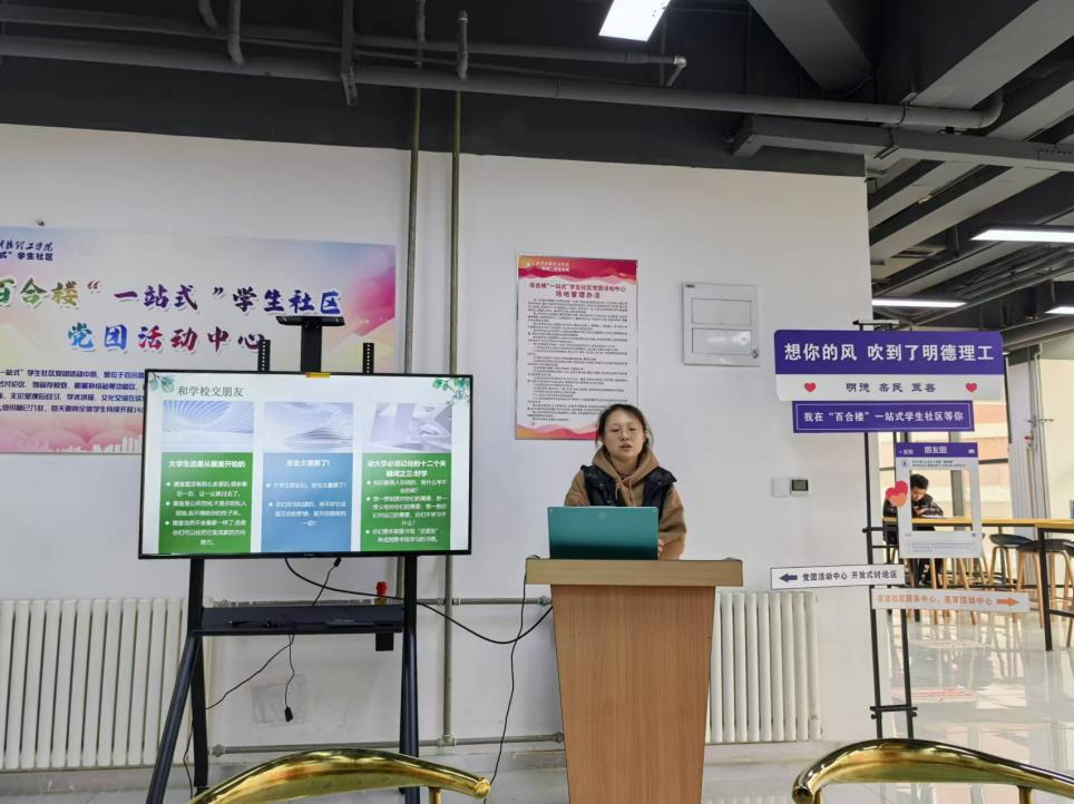 邀请到第二位老师是高等职业技术学院李一迪老师,李老师用生动的语言、真挚的情感,通过“交朋友”以及“悟人生”两个方面,分享了她阅读《我与大学生朋友们的交流》书籍带给自己的感悟和启示。结合书中内容,李老师谈到“和学校交朋友”学会从寝室、图书馆出发,把寝室变成家的方向努力,养成到图书馆学习的习惯;“和社会交朋友”要明确课余时间是剩余时间的存储室,谁从这里捞取的剩余时间多,谁就更接近成功。“和思想交朋友”多思考运用理论知识武装自己,多走进社会实践活动,丰富自己第二课堂活动提高自己。最后,李老师通过自己的读书感悟,谈“悟人生”,鼓励在场同学们要肩负起实现中华民族伟大复兴的神圣使命,关心国家大事,增长“社会年龄”,为中华民族的伟大复兴而努力奋斗。