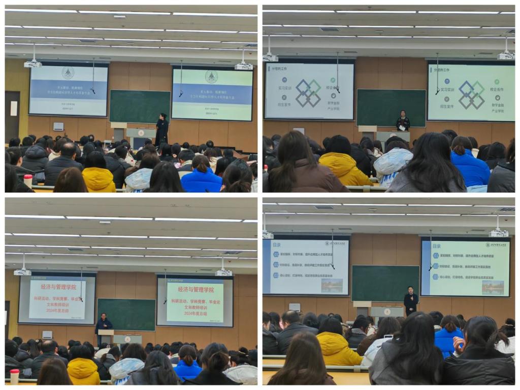 为深入贯彻落实党的二十届三中全会精神和全国教育大会精神,增强学院教职工干事创业的主动性与凝聚力,推动教学评建工作稳步前进,12月25日中午,经济与管理学院在7号教学楼102教室召开全体教职工大会,学院班子成员和全体教职工参加了大会。会议由学院党委书记兼行政副院长何文举主持。