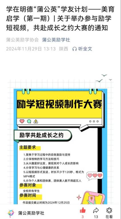学在明德“蒲公英”学友计划—— 美育启学(第一期)举办励学短视频大赛,激励同学们相互学习,共同进步。