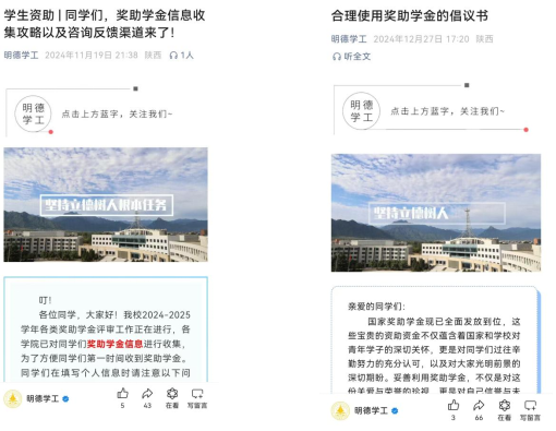 学校积极推进融合门户学工系统的学生资助模块数字化应用,现已实现奖、助学金、勤工助学、临时困难补助资助工作的线上申报、查询与管理。用工单位、学生可以通过明德app线上申报勤工助学岗位并查看薪资情况,规范勤工助学流程,用工需签订勤工助学三方协议书、工作承诺书等。遇到临时困难时学生可以第一时间线上申请得到帮助,减少等待环节。通过数字化手段,资助工作实现了精准化和高效化,极大提升了工作效率和学生满意度。
