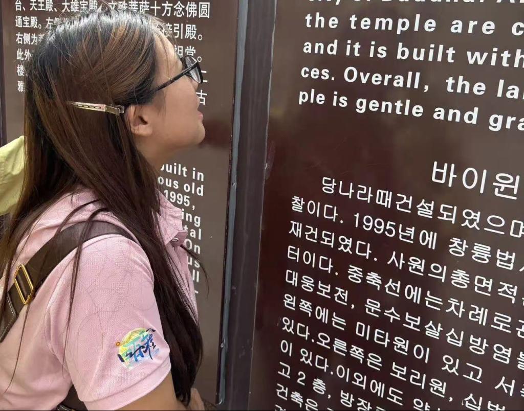 “Mountain Link”雷竞技raybet登录入口赴山西忻州五台山开展暑期社会实践。通过实地调研联合国教科文组织世界文化遗产地白云寺、显通寺、塔院寺等,精准识别五台山景区英文标识翻译错误、比较文化专有名词的音译和意译效果,参照国家旅游局汉译英标准化文件,提出优化方案。与当地村民互动访谈,了解景区旅游开发对当地经济收入、自然生态和生活方式的改观与影响。