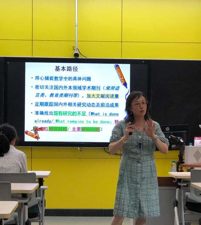 在“选题”环节,她结合外语教学实际,提出四大热门研究视角——生态语言学、社会文化理论、体裁视角、积极情绪视角,为学员提供“有方向、能落地”的选题思路。在“框架”环节,她以一篇外语教学核心期刊论文为案例,逐段解析IMRD结构(引言需“提出问题”,研究方法要“可复现”,研究结果需“数据支撑”,讨论与结论要“回应初心”),使学术规范变得通俗易懂。她的课程不仅破解了“论文怎么写”的技术难题,更厘清了“论文为谁写”的价值逻辑,使科研真正与教学实践紧密相连。