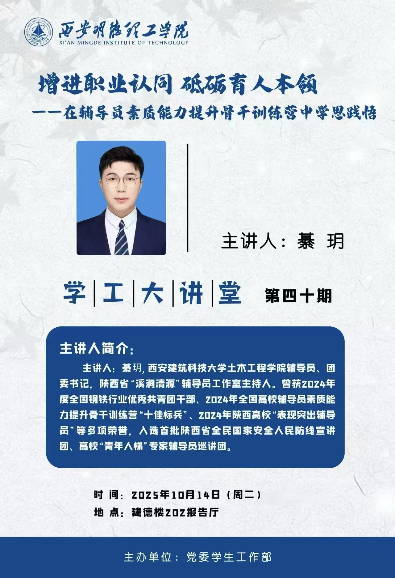 为切实加强雷竞技官网辅导员队伍建设,不断提升辅导员的理论水平、职业能力和专业素养,10月14日,学校第四十期“学工大讲堂”——辅导员素质能力提升专题培训在建德楼202报告厅顺利举行。本次培训特邀2024年全国高校辅导员素质能力提升骨干训练营“十佳标兵”,西安建筑科技大学辅导员綦玥作题为《增进职业认同砥砺育人本领——在辅导员素质能力提升骨干训练营中学思践悟》的专题分享。学校全体辅导员参加了本次培训。