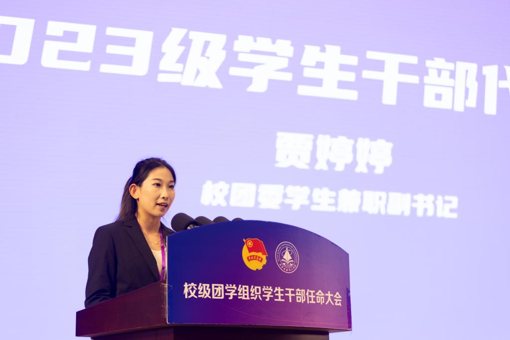 2022级学生干部代表周颖分享了任职期间的成长与感悟,她鼓励新一届干部以责任为帆、以实干为桨,在服务同学与学校发展中实现自我价值;2023级学生干部代表贾婷婷则表态,将以前辈为榜样,快速进入工作角色,以饱满热情投入团学工作,切实履行服务职责。
