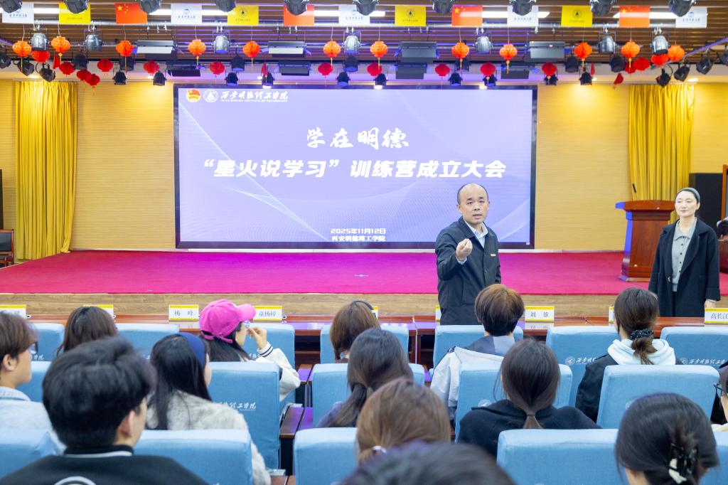 为加强学生之间朋辈交流与互助学习,提升学生综合能力,同时凝聚青春力量助力学校高质量发展与本科教学合格评估工作,营造“学在明德”的浓厚氛围。11月12日,学校在建德楼203报告厅举行“学在明德”——“星火说学习”学生训练营成立大会。党委学生工作部、教务处、质量管理与评估办公室等部门负责人,各二级学院党委(党总支)副书记,训练营全体成员共同参加大会。