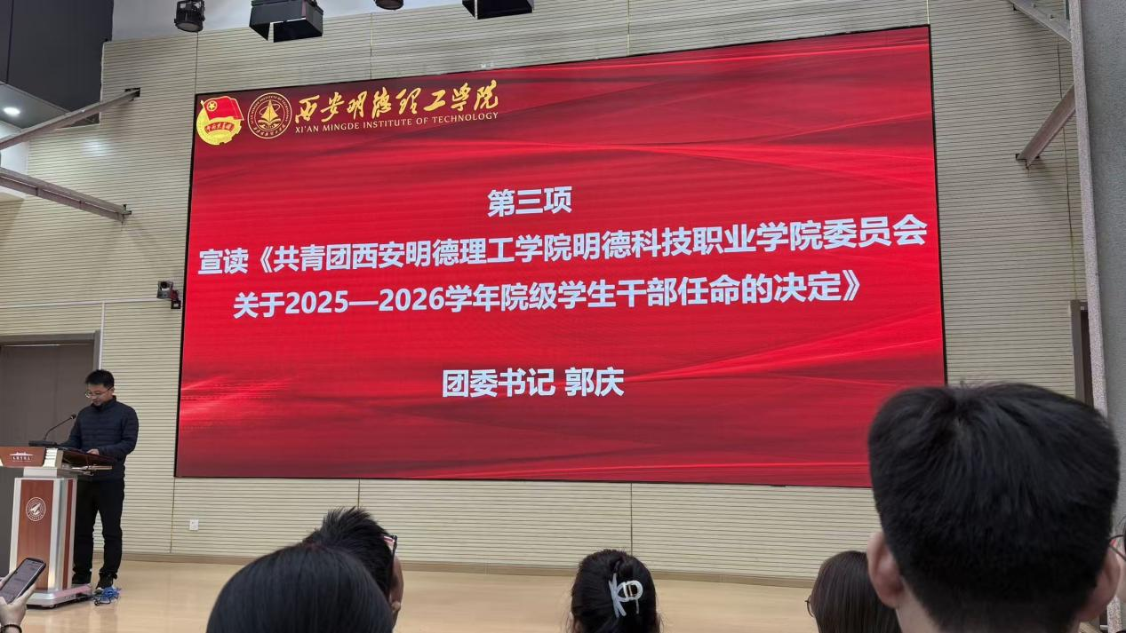 大会在激昂的共青团团歌和校歌声中拉开序幕,郭庆宣读了《共青团雷竞技raybet登录入口明德科技职业学院委员会关于2025-2026学年院级学生干部任命的决定》。他感谢学院第四届团委团学干部们的付出与奉献,同时他希望新一届团学干部能够牢记使命,认真履行职责,共同书写学院的美好未来!
