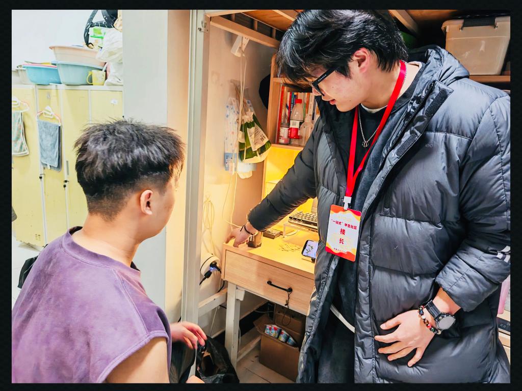 他们通过日常走访、舍长微信群、宿舍门口意见箱等多种渠道,广泛收集同学们在住宿生活、设施维修、服务保障等方面的需求与建议。从“宿舍漏水”“宿舍花洒出水很小”等小事,到“希望宿舍暖气更热一点”等共性诉求,楼层长们都一一记录在需求台账上。对于能现场协调解决的小问题,他们主动对接宿管人员处理;对于复杂诉求,及时上报学工部、后勤保障处等职能部门,并全程跟踪办理进度,确保“件件有回音、事事有着落”。当同学们反映的问题得到妥善解决,一句句真诚的“谢谢”,成为楼层长们坚守岗位的暖心动力。