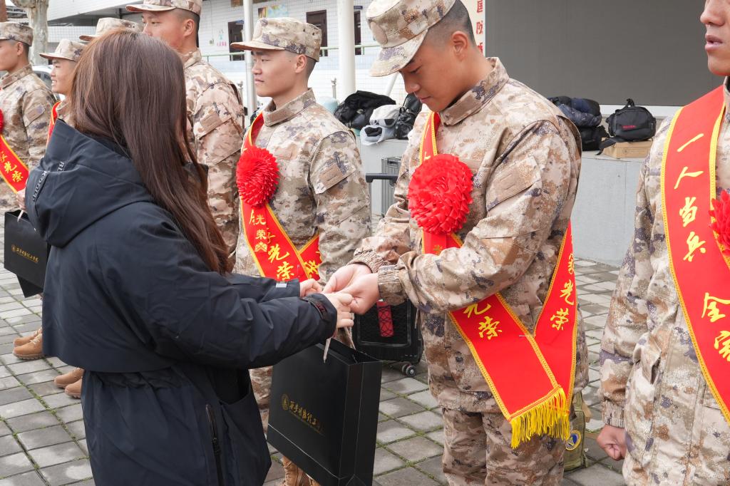 慰问环节,学校为学子们精心准备了慰问品,每一份都承载着母校的牵挂与期许。辅导员们为新兵送上慰问品,叮嘱大家严守纪律、砥砺品格。退役大学生士兵朱利韦为新兵一一整理红花与绶带,以“老兵”身份传递“新兵”力量,勉励他们刻苦训练,争做有灵魂、有本事、有血性、有品德的新时代革命军人。