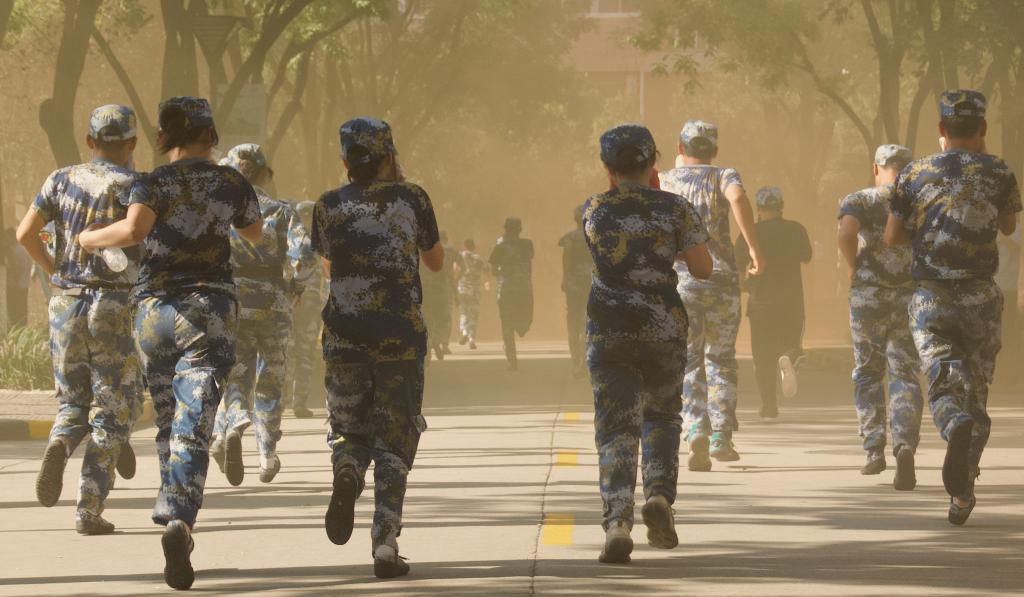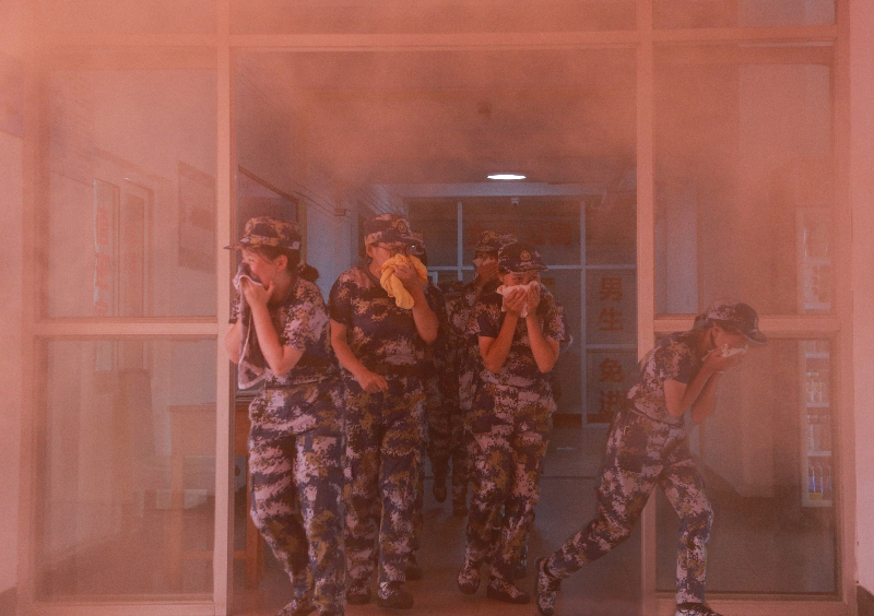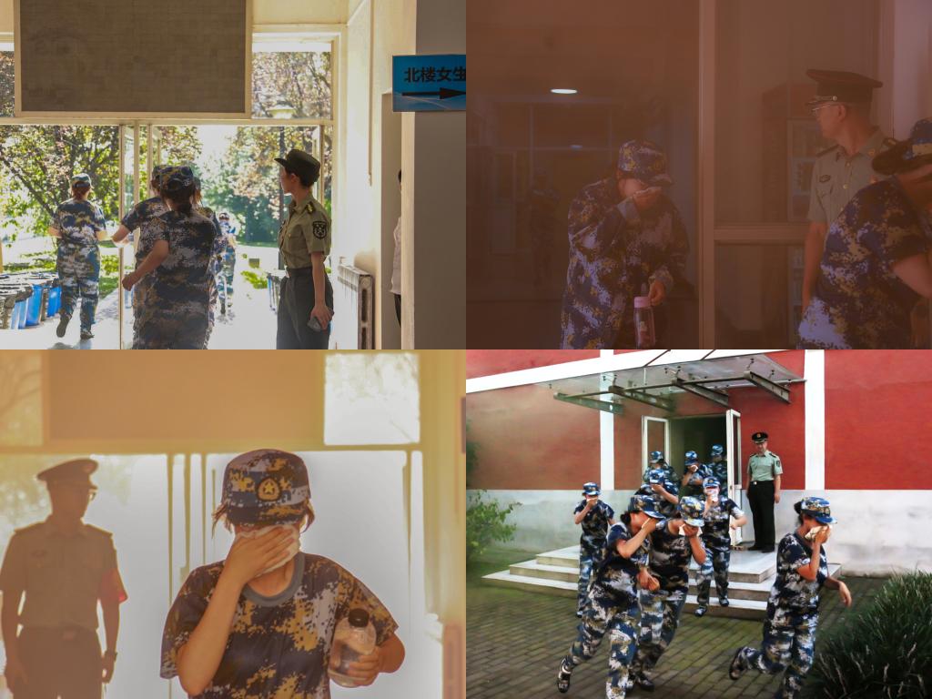 下午16时15分,楼内冒出阵阵浓烟,警铃声响彻校园,消防安全紧急疏散随即展开,参训教官、全体军训团军政干部在各消防疏散口协助指引,迅速组织楼内学生向外疏散,同学们弯着腰,用湿手帕、湿纸巾等捂住口鼻快速前行。整个疏散工作险而不惊、忙而不乱,同学们注意力高度集中、认真对待,按照规定路线、有序地撤离至安全地带,全程用时2分38秒。