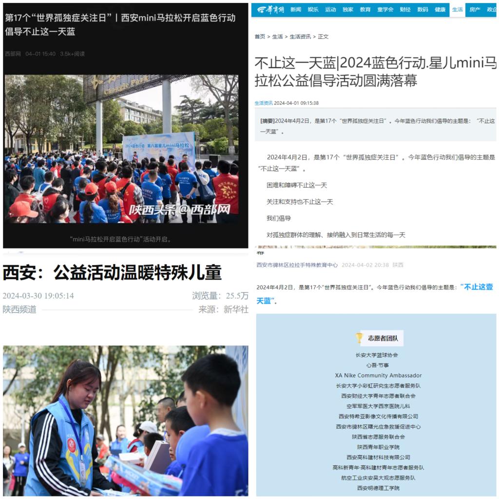 2024年4月2日是第17个“世界自闭症关注日”,为了更好地贯彻“全生涯服务,全方位关爱”的宣传主题, 3月30日,西安市碑林区拉拉手特殊教育中心联合陕西妇女儿童发展基金会、陕西懿传社会工作服务中心、各爱心单位及各高校公益组织在西安市碑林区长乐公园举办 “2024蓝色行动·第八届星儿mini马拉松”活动,当天200多名“星儿”及其家长参加此次特殊的马拉松,艺术与设计学院团委及实践部共7名成员组成摄影志愿服务队参与此次活动,与长安大学、西安财经大学等高校志愿组织共同相约度过精彩而又特别的一天,活动受到新华社、华商网、陕西头条等多家媒体报道。