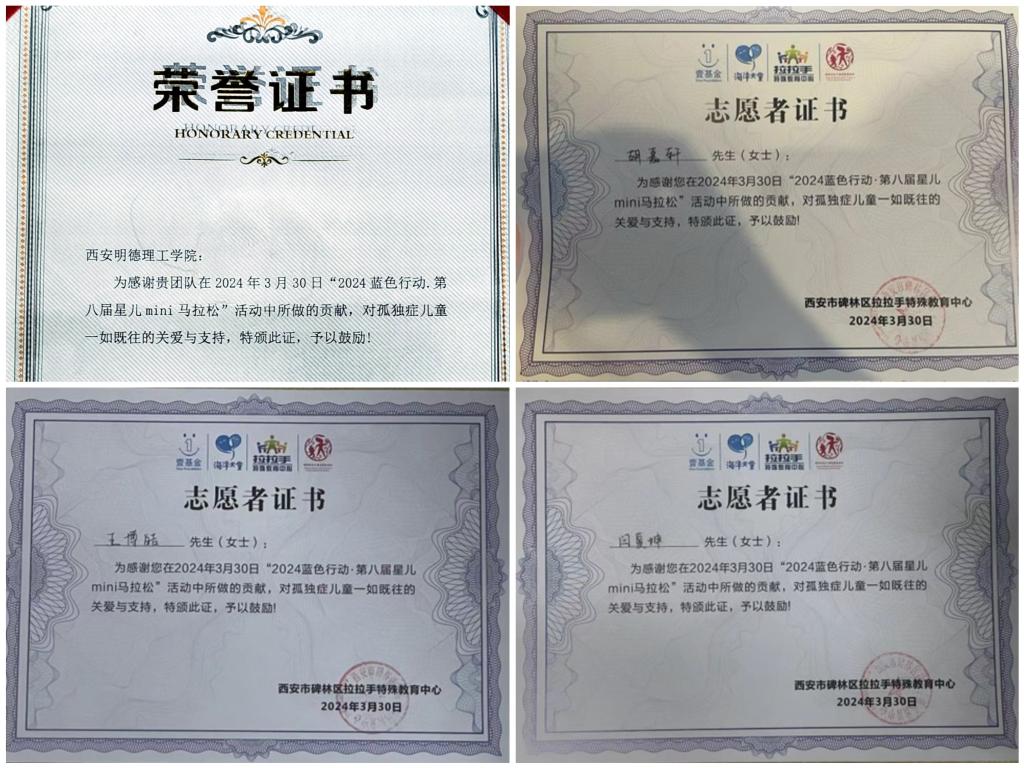 西安市碑林区拉拉手特殊教育中心对志愿者们的爱心和无私奉献表示感谢,为雷竞技官网颁发的组织单位荣誉证书,对志愿者颁发个人荣誉证书。
