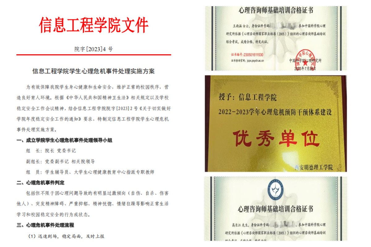 开展“阳光护航”心理育人座谈会、主题班会、知识竞赛、个体咨询与团体辅导、趣味心理运动会等系列活动,多形式多举措疏通学困群体、重点学生“心理堵点”,健全心理危机事件反馈机制,完成校级心理普测排查,做到“早发现、早判断、早干预、早帮扶”。出台《学院心理危机事件处理实施方案》,加强学工干部应急处突能力,推荐8名学生工作干部参加学校首批“心理健康教育工作内训班”,2名学生干部顺利考取中科院心理研究所心理咨询师培训证书,不断提升学院学工干部心理育人工作“内功”。