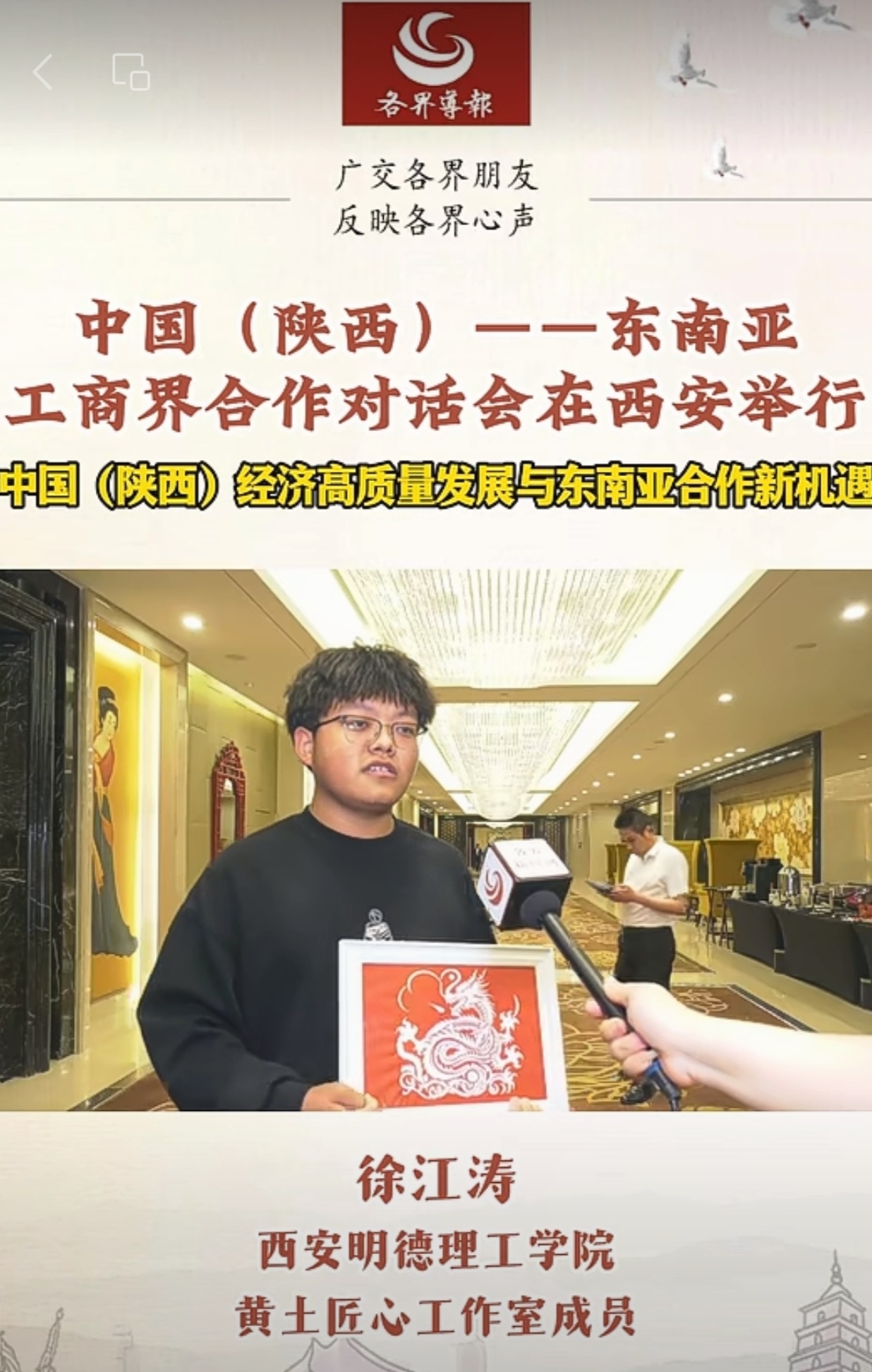 最后,黄土匠心工作室接受了各界新闻网的采访,并深感荣幸地表示:此次参加中国(陕西)-东南亚工商界合作对话会是一次难得的机会,不仅让黄土匠心工作室的剪纸艺术得到了更广泛的传播,也为工作室未来的发展开辟了新的道路。同时,为我们提供了更宽广的国际视野和学习平台,期待未来能继续与东南亚国家深化合作,共同推动中国传统艺术走向世界。
