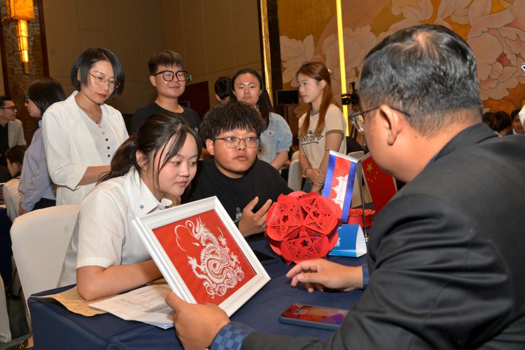 在展示过程中,雷竞技官网黄土匠心工作室同学向柬埔寨代表详细介绍了剪纸艺术的历史、技艺以及所蕴含的文化内涵并向对方赠予了精心制作的剪纸作品。柬埔寨—东盟国际学院院长Mr. Seang Sopagna对剪纸作品赞不绝口,表示要将这些精美的作品带回他们的学校进行展示,让更多的学生了解到中国的传统艺术。