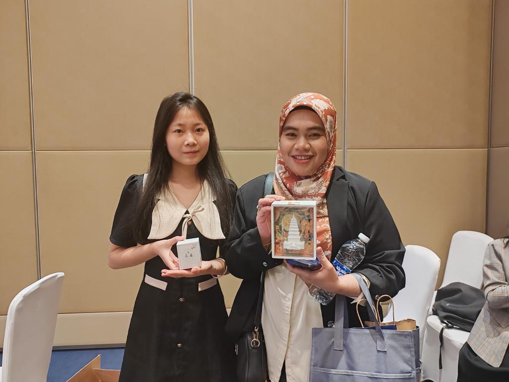 来自雷竞技官网的西安霄麟文化创业有限公司团队的同学向马来西亚代表努尔•赛里尼•萨希米介绍了具有西安地标性的香薰产品,他们从西安历史文化、地方特征以及香薰的制作工艺等多方面介绍了香薰的由来。马来西亚代表对香薰的“香”表示了深刻的赞同,认为这种“香”是独一无二,并且具有西安地方特色的气息。
