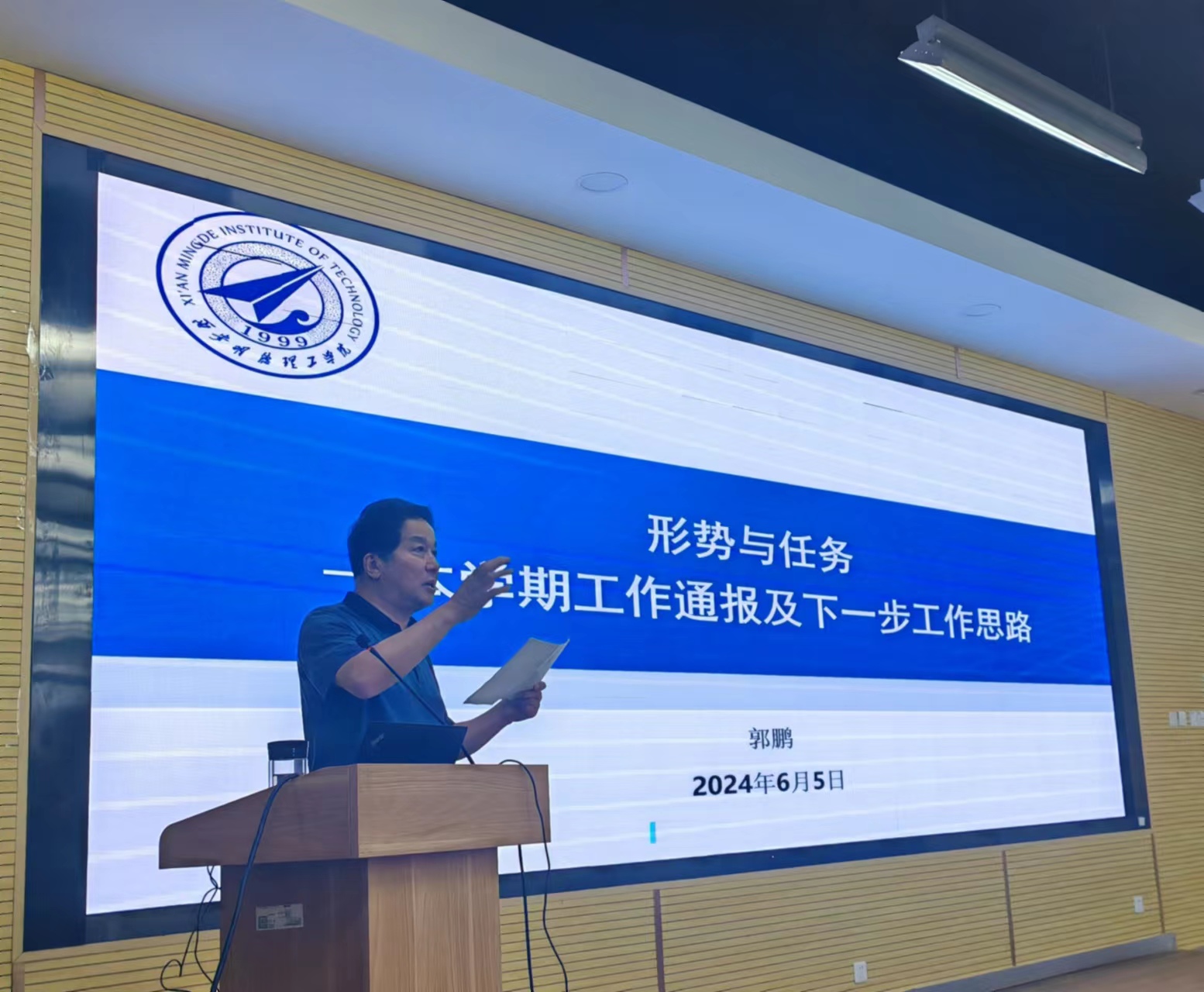 会议伊始,院长郭鹏教授介绍了本学期新进教师,以“形势与任务——本学期工作通报及下一步工作思路”为题,分析了当前学院发展与评估中的问题与压力,结合学校2024年目标责任书对学院现阶段工作进行了总结,对下一步工作做了安排部署。他要求全体教职工各尽所能,守住合格评估底线,努力提高学生满意度和就业率,号召大家共克时艰、共渡难关、共谋发展、共同发力、提升专业建设水平,以评促建,确保教育教学质量。