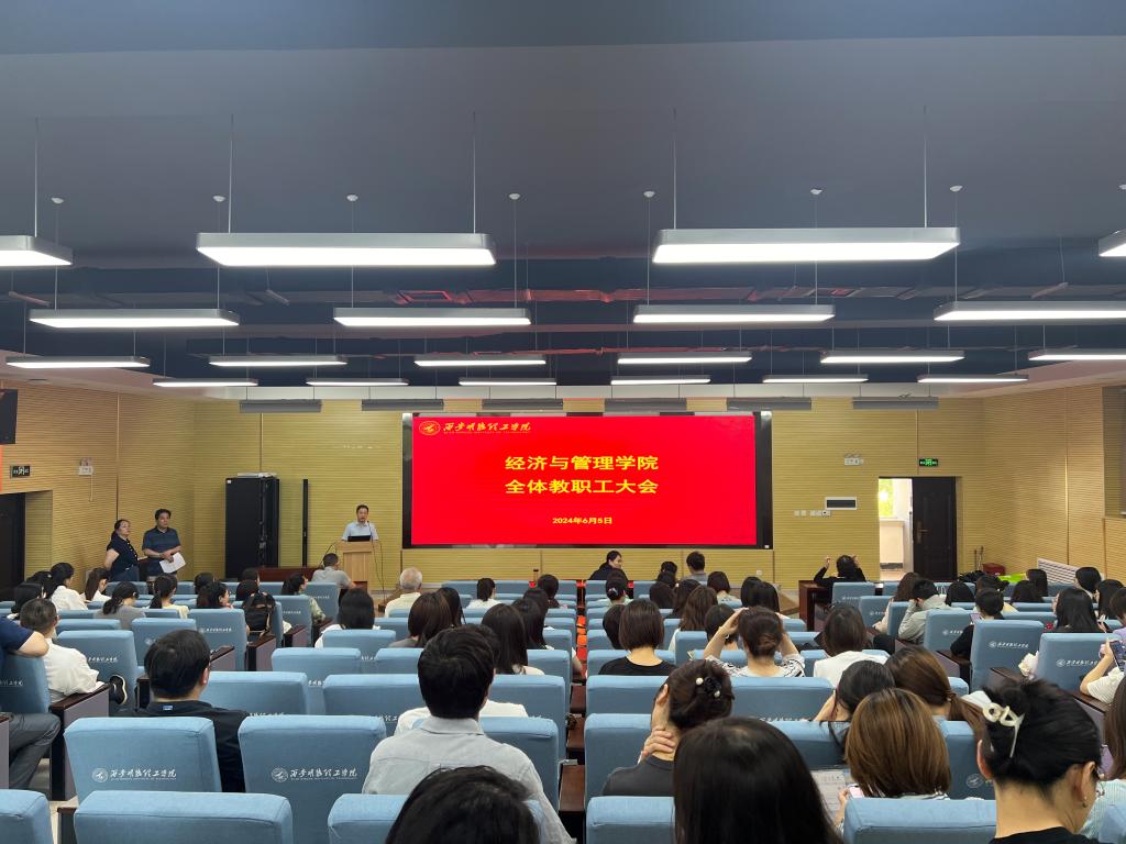 为深入推进本科教学工作合格评估进度,彰显办学特色和亮点,6月5日中午,经济与管理学院在建德楼202召开全体教职工大会,会议由学院党委书记何文举主持,学院班子成员和全体教职工参加大会。