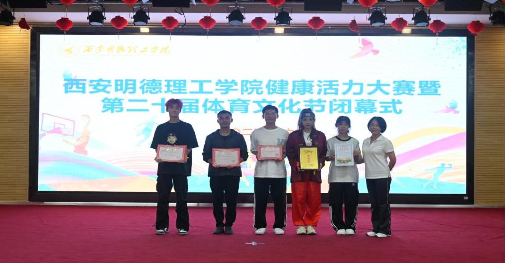颁奖仪式前,来自各二级学院的9支队伍进行了健康活力大赛精彩比拼。他们通过热情饱满的笑容和整齐划一的动作赢得了现场观众阵阵掌声。