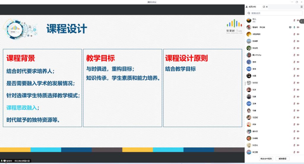 智慧树课程顾问从课程设计、讲稿和ppt准备、拍摄间拍摄、视频审核及上线资料准备这五个环节,对课程建设内容进行了详细的讲解。讲解结束后,与会老师就课程建设建设等问题展开了热烈讨论。他们纷纷表示进一步了解了课程录课的环节和内容,对课程建设有了更明确的方向。