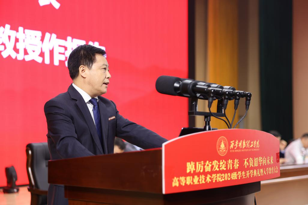 院长舒忠教授作了“踔厉奋发绽青春,不负韶华向未来”主题报告。首先,代表学院为2024级新生们送去暖心祝福;其次,从学校及学院概况、专业及师资情况、校企合作、实践教学、“五位一体”人才培养体系等五个方面做了精彩概述;最后期望对学生们提出了殷切希望,激励学生们以学习为根,明德修身,以自我管理为枝,勇于担当,以勤奋好学为干,拼搏进取,以踔厉奋发为果,不负韶华。希望同学们在新的征程里,不断发扬“勤奋、严谨、求实、创新”的学习之风,努力拼搏,不断超越,再创新的辉煌!
