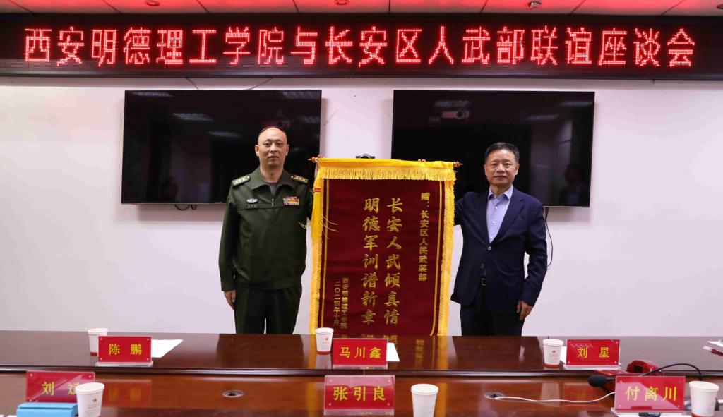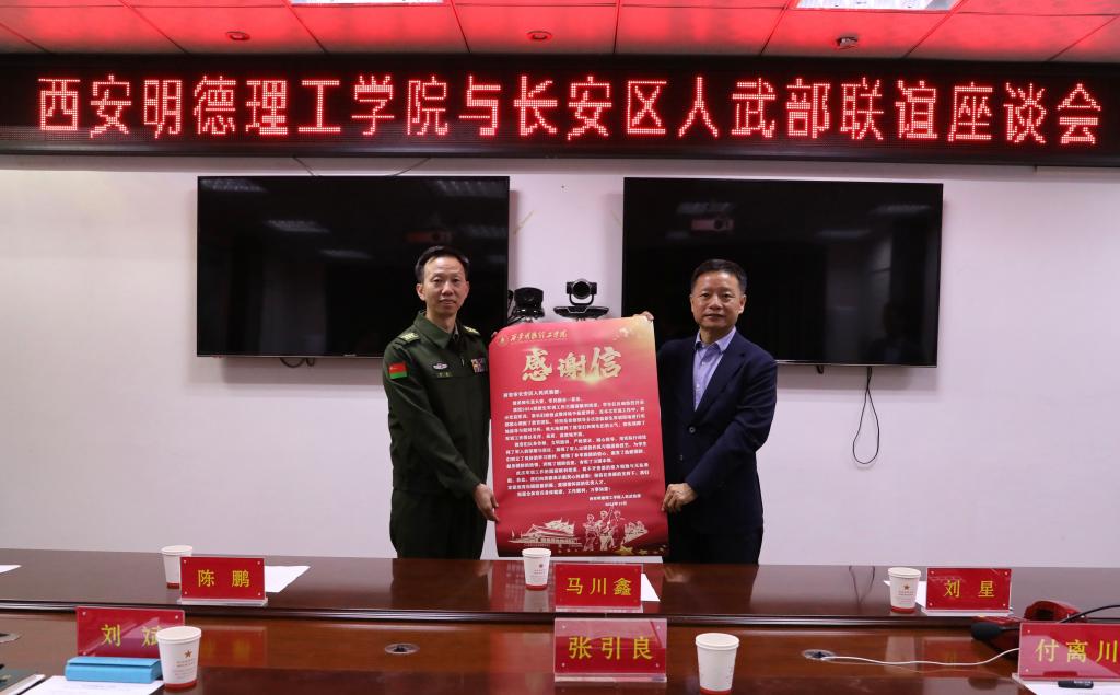 座谈结束后,马川鑫代表学校向长安区武装部分别赠送了锦旗和感谢信。