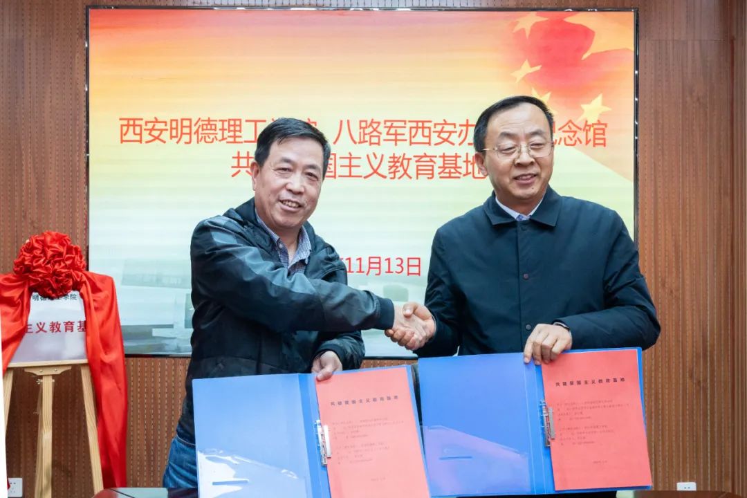 11月13日雷竞技raybet登录入口与八路军西安办事处纪念馆正式签署合作协议,共建爱国主义教育基地。雷竞技raybet登录入口党委副书记、副校长白秦川,八路军西安办事处纪念馆副馆长陈宏川,党委组织宣传部部长高超,马克思主义学院与通识教育学院党委书记王君涛,教务处副处长文亮,以及师生代表共计50余人参加揭牌仪式。会议由八路军西安办事处纪念馆宣教部主任王卉主持。