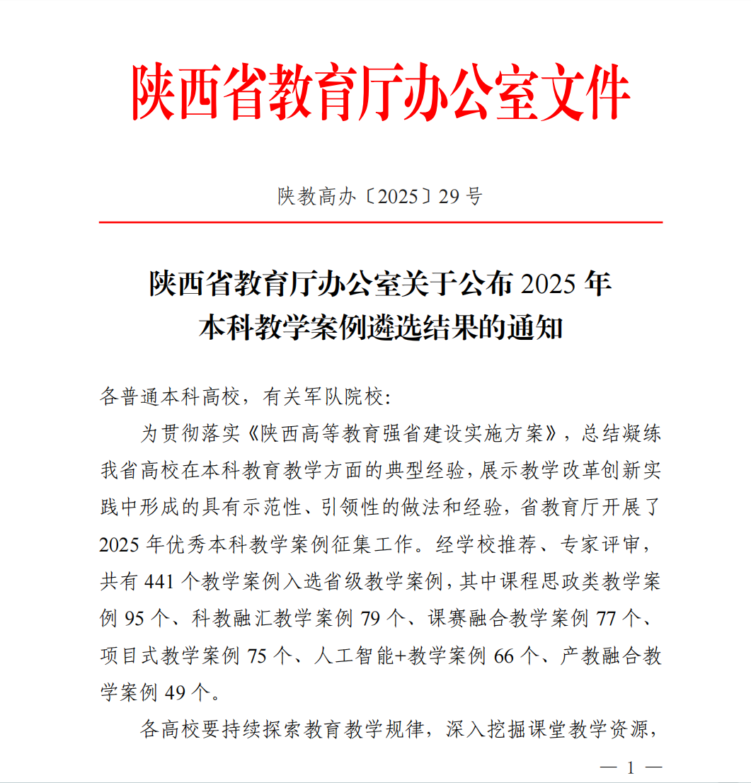 本次省级教学案例征集工作,是陕西省教育厅为贯彻落实《陕西高等教育强省建设实施方案》精神,推动高校总结凝练典型经验、展示推广示范性教学成果而开展的重要举措。在此高规格、高标准的评选中脱颖而出,彰显了学校深厚的教学底蕴与蓬勃的创新活力。