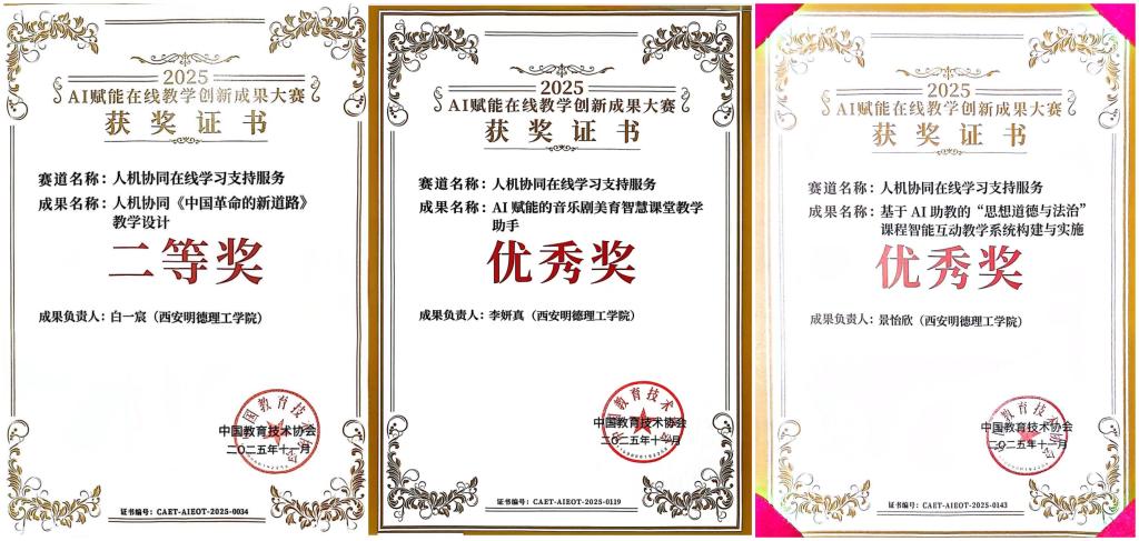 近日,由中国教育技术协会主办的首届“AI 赋能在线教学创新成果大赛” 颁奖仪式在北京印刷学院隆重举行。雷竞技官网马克思主义学院白一宸老师凭借《人机协同〈中国革命的新道路〉教学设计》荣获二等奖,通识教育学院李妍真老师的《AI 赋能的音乐剧美育智慧课堂教学助手》、马克思主义学院景怡欣老师的《基于 AI 助教的 “思想道德与法治” 课程智能互动教学系统构建与实施》获优秀奖,三位教师凭借扎实的教学功底与前沿的创新理念,在全国赛事中脱颖而出,为学校赢得了荣誉。