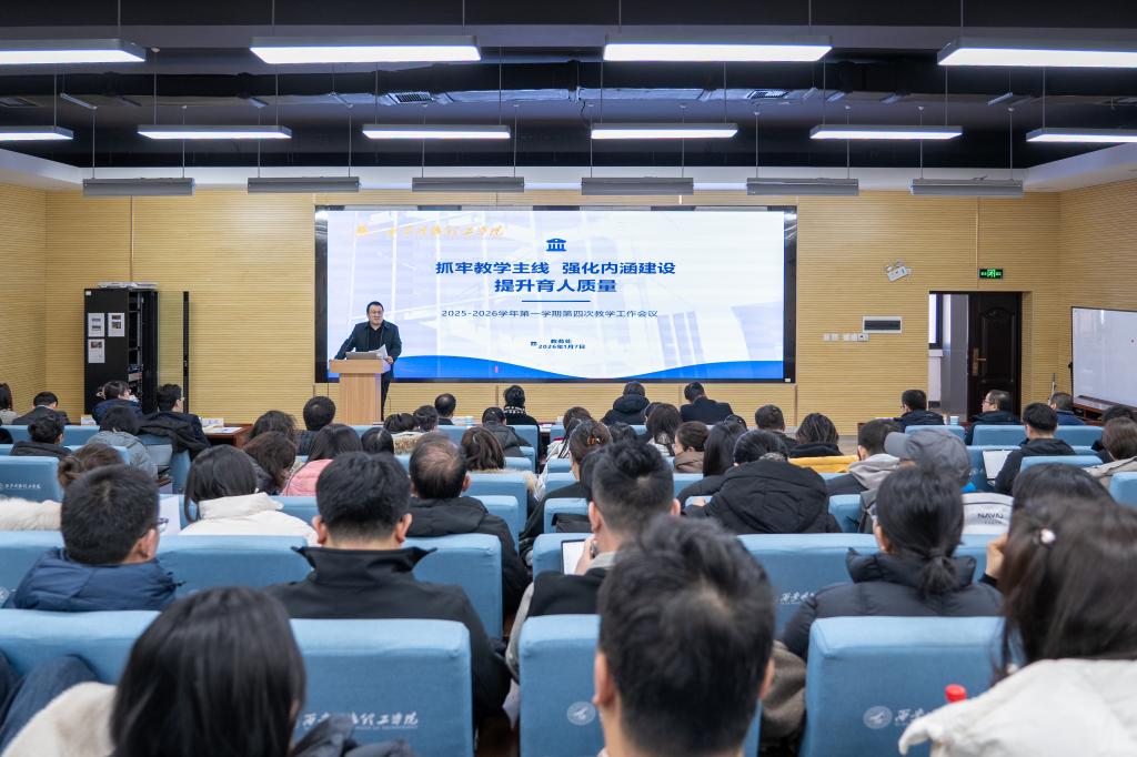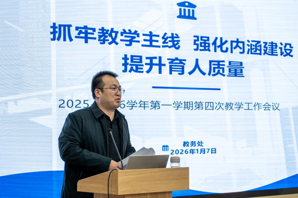 为进一步规范教学管理,夯实内涵建设,全面提升育人质量,2026年1月7日下午,学校在6号建德楼202报告厅召开2025-2026学年第一学期第四次教学工作会议。教学副校长朱延波出席会议,各二级学院院长、副院长、办公室主任、专业负责人/教研室负责人、教务员以及教务处全体教学管理人员参加。会议由教务处副处长文亮主持。