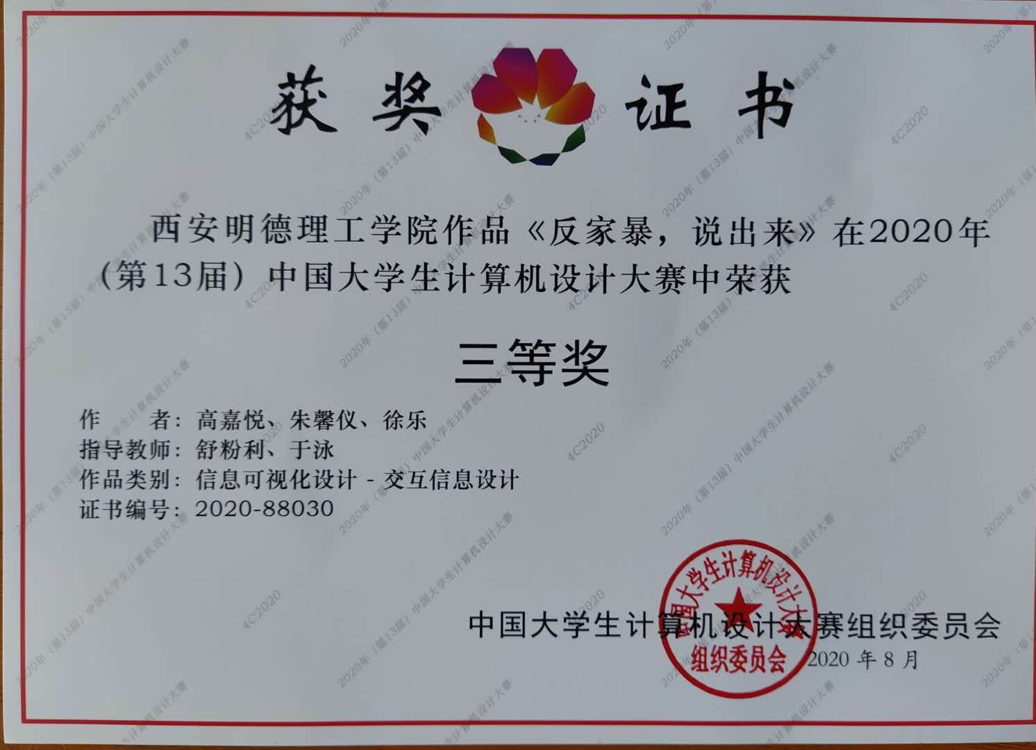 经过西北赛区严格审核,艺术与设计学院有3组作品推荐进入国家级比赛。在2020年7-8月,决赛是以线上答辩讲解的形式由厦门大学和山东大学承办。最终,《青海之寻》获得二等奖;《小小鸟》和《反家暴,不可说》获得三等奖的佳绩。以下是获奖详情。