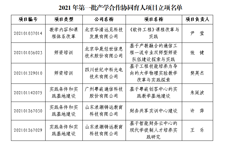 8月24日,教育部高等教育司发布《2021年第一批产学合作协同育人项目立项名单的通知》(教高司函〔2021〕14号),雷竞技官网6个项目获批立项,立项项目涉及 “教学内容和课程体系改革”“师资培训”“实践条件和实践基地建设”等3个项目类别。