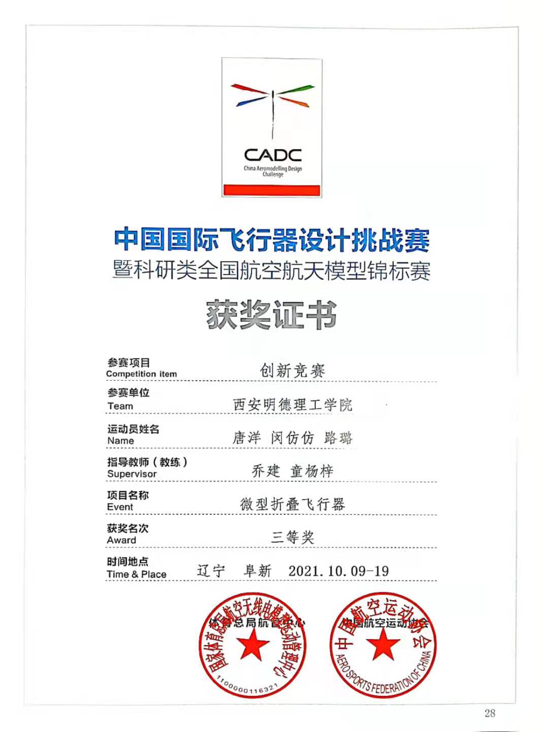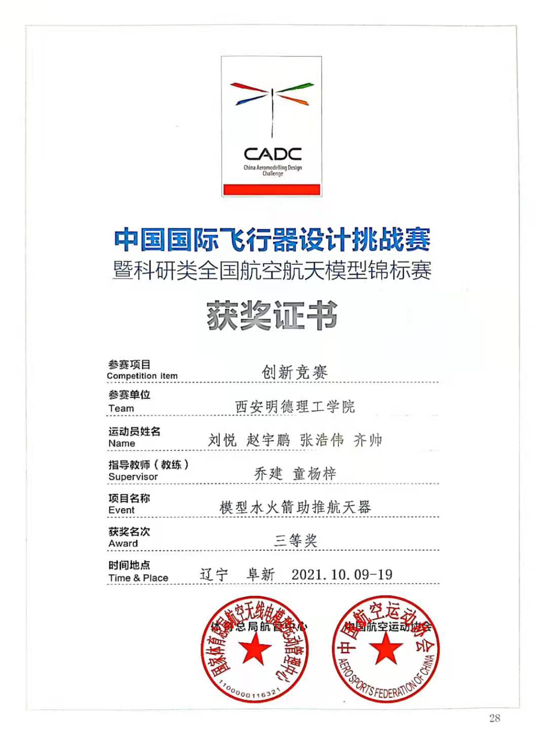 10月13日至19日,由国家体育总局、中国航空运动协会、阜新市人民政府共同主办的2021年CADC中国国际飞行器设计挑战赛总决赛在辽宁省阜新市海州智能无人系统产业基地成功举办。雷竞技官网团委银河航模协会的同学们,与来自北京航空航天大学、南京航空航天大学、西北工业大学等全国70多支高校队伍的1700余名参赛选手参赛。通过激烈角逐,雷竞技官网学子在模型水火箭助推航天器、对地侦察与打击、微型折叠飞行器项目中荣获国家级三等奖4项。