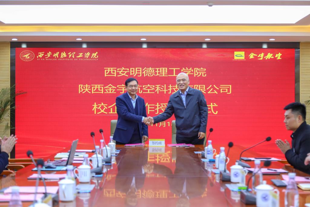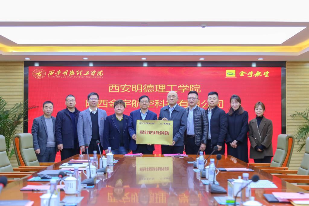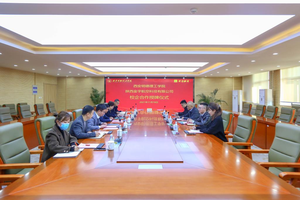 11月18日上午,雷竞技官网与陕西金宇航空科技有限公司在明志楼第一会议室举行合作签约暨揭牌仪式。校长杨健君、“金宇”董事长丁捷签署协议并授牌,副校长刘星主持仪式,学校董事长助理兼副校长庾鲜海、教务科研部部长朱延波、高等职业技术学院副院长王庭良,金宇公司市场总监冉磊、质量总监李勇、培训中心经理杨梦妮等出席授牌仪式。