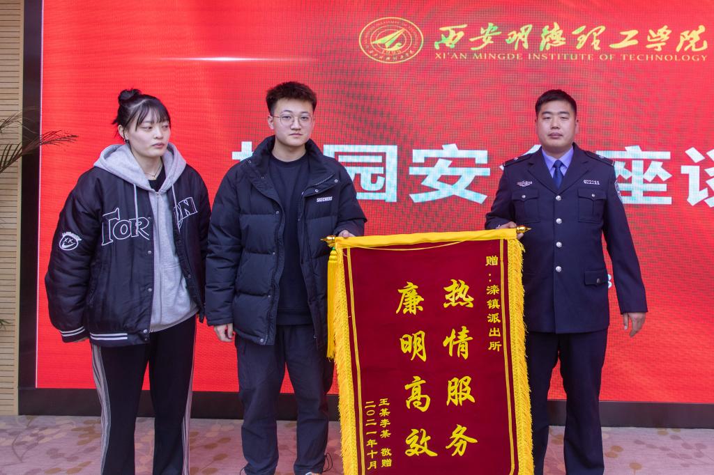 座谈会上,各学院党委(党总支)书记、副书记就学生安全方面易出现的相关问题同派出所民警进行了广泛交流,并对派出所民警日常对学生的保驾护航表示感谢,学生代表现场向滦镇派出所赠送了锦旗。