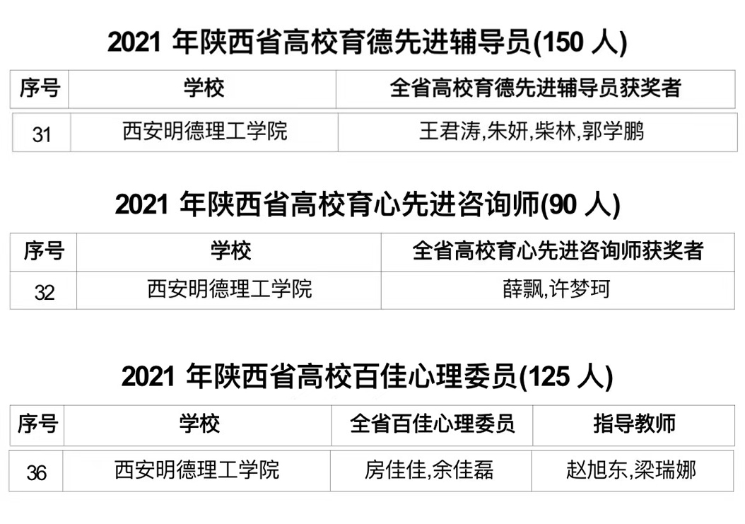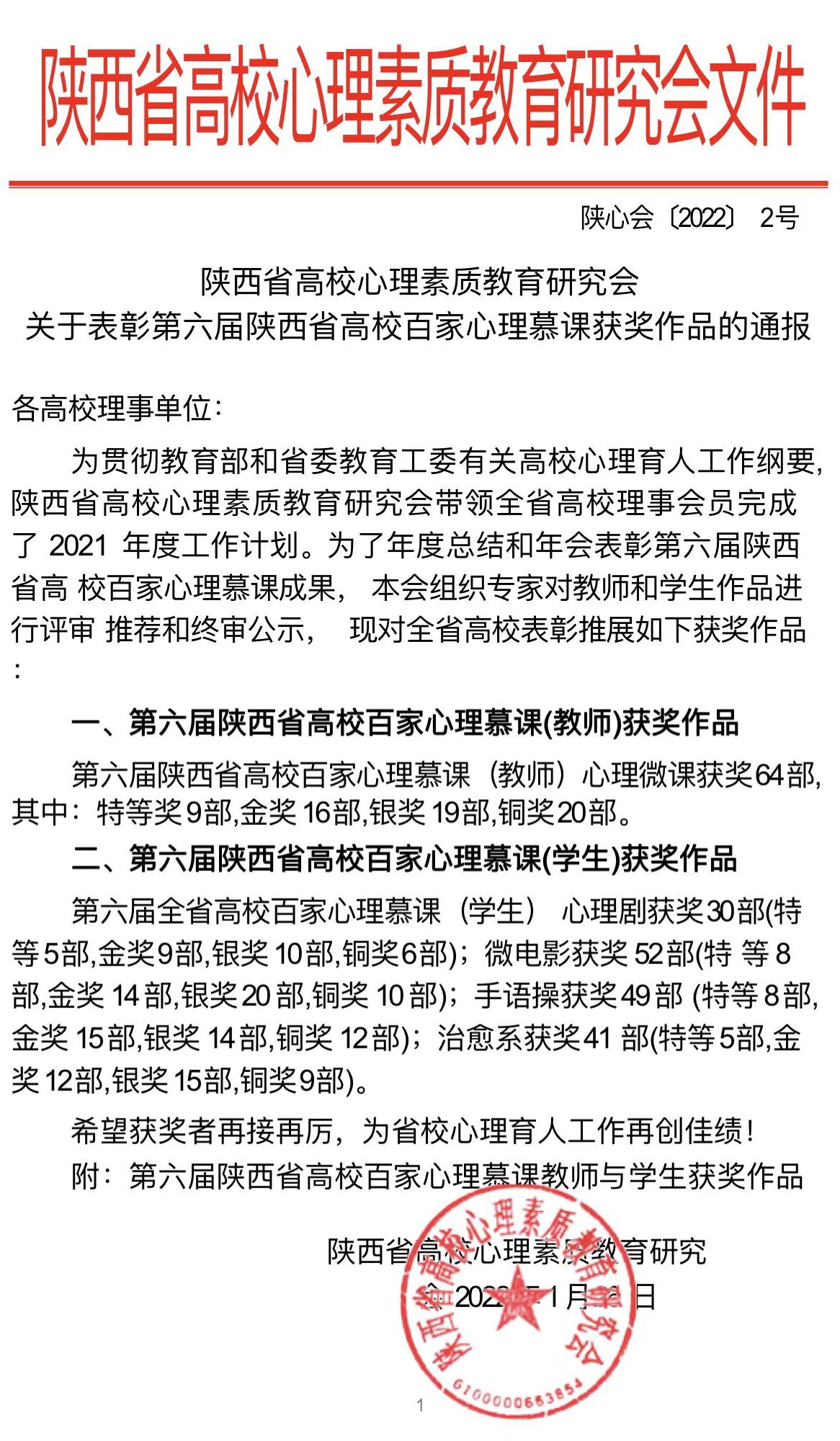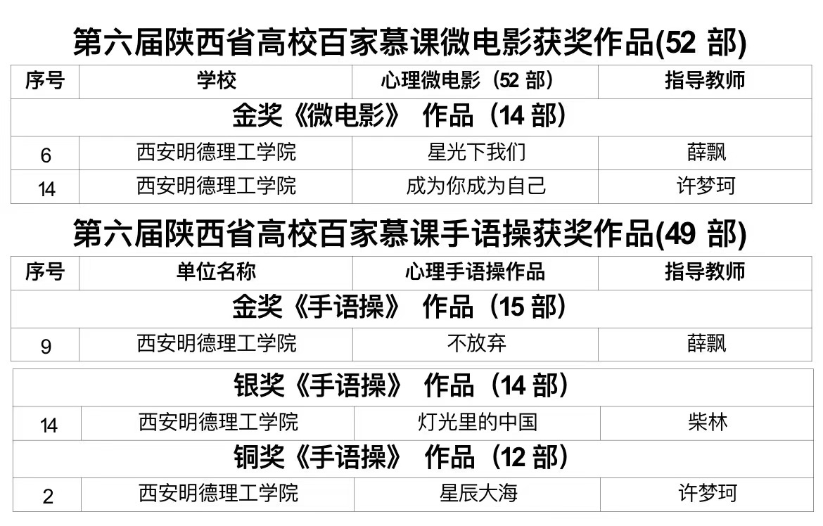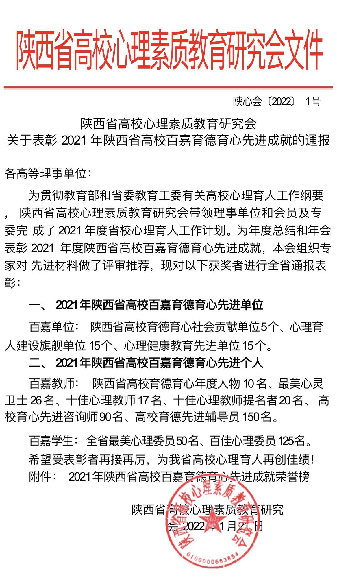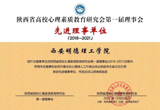 近日,学校心理健康教育工作获得陕西省高校心理素质教育研究会多项表彰。雷竞技raybet登录入口荣获陕西省高校心理素质教育研究会“先进理事单位”,2人荣获“2021年陕西省高校育心先进咨询师”,4人荣获“2021年陕西省高校育德先进辅导员”,2人荣获“2021年陕西省高校百佳心理委员”,2部校园心理微电影荣获“第六届陕西省高校百家慕课微电影金奖作品”,3部校园心理手语操分别荣获“第六届陕西省高校百家慕课手语操获奖金奖作品、银奖作品、铜奖作品”。