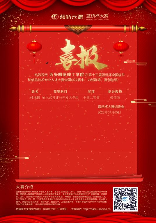 近日,第十三届“蓝桥杯”全国软件和信息技术专业人才大赛(电子类)国赛结果揭晓,雷竞技官网信息工程学院参赛学生付坤鹏同学荣获全国二等奖,其在张伟岗老师的带领下所完成的竞赛项目为“嵌入式设计与开发大学组”。