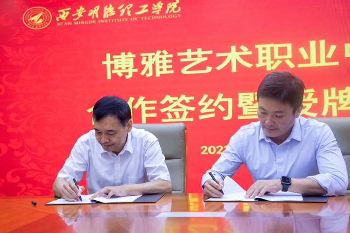 仪式最后,校长杨健君代表雷竞技官网与博雅艺术职业中学签署“合作协议书”,为同时为博雅艺术职业中学授予了“优质生源基地”、“明德博雅艺术类教育教学基地”、“就业实习基地”牌匾。