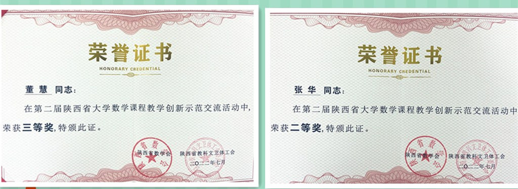 2022年7月,陕西省数学会大学数学教学委员会和陕西省教科文卫体工会组织举办了第二届陕西省大学数学课程教学创新示范交流活动。经过激烈的角逐,通识教育学院数学教研室教师张华、董慧分别荣获二等奖、三等奖。