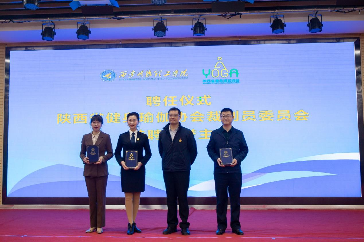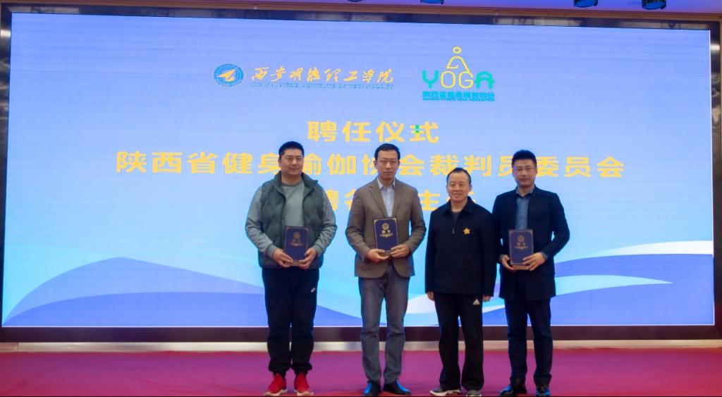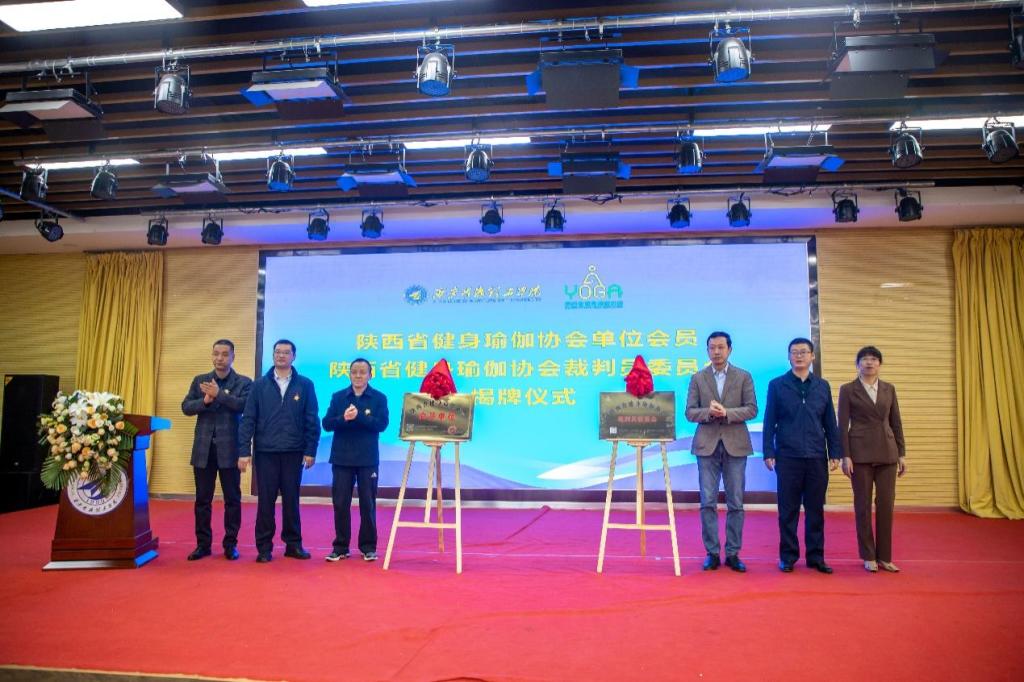 陕西省健身瑜伽协会主席金新刚、党支部书记郭飙、副主席孟周焕与雷竞技raybet登录入口党委副书记董昊、马克思主义学院与通识教育学院党委书记王君涛、识教育学院副院长郑薇共同为“陕西省健身瑜伽协会单位会员”“陕西省健身瑜伽协会裁判员委员会”揭牌,并将裁判员委员会挂靠雷竞技raybet登录入口。