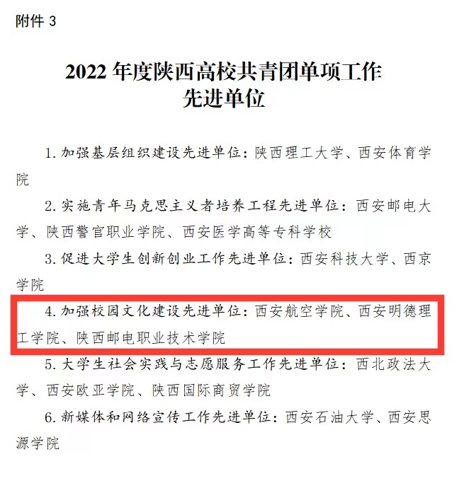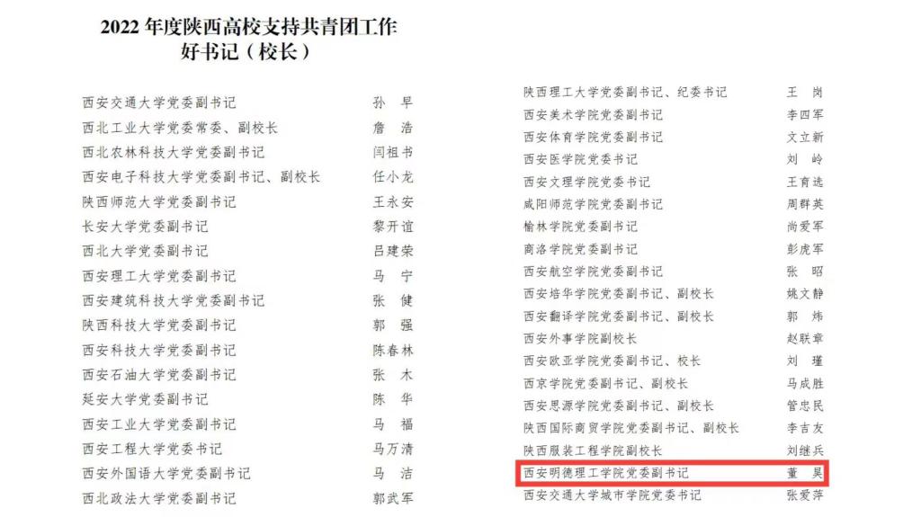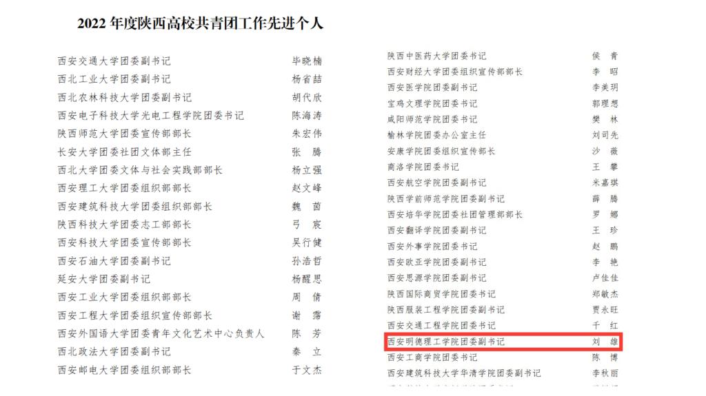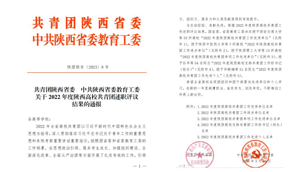 近日,共青团陕西省委、中共陕西省委教育工委联合发布了《共青团陕西省委、中共陕西省委教育工委关于2022年度陕西高校共青团述职评议考核结果的通报》文件,其中雷竞技官网荣获“加强校园文化建设先进单位”,校党委副书记董昊荣获“2022年度陕西高校支持共青团工作好书记(校长)”荣誉称号,校团委副书记刘雄获“2022年度陕西高校共青团工作先进个人”荣誉称号。